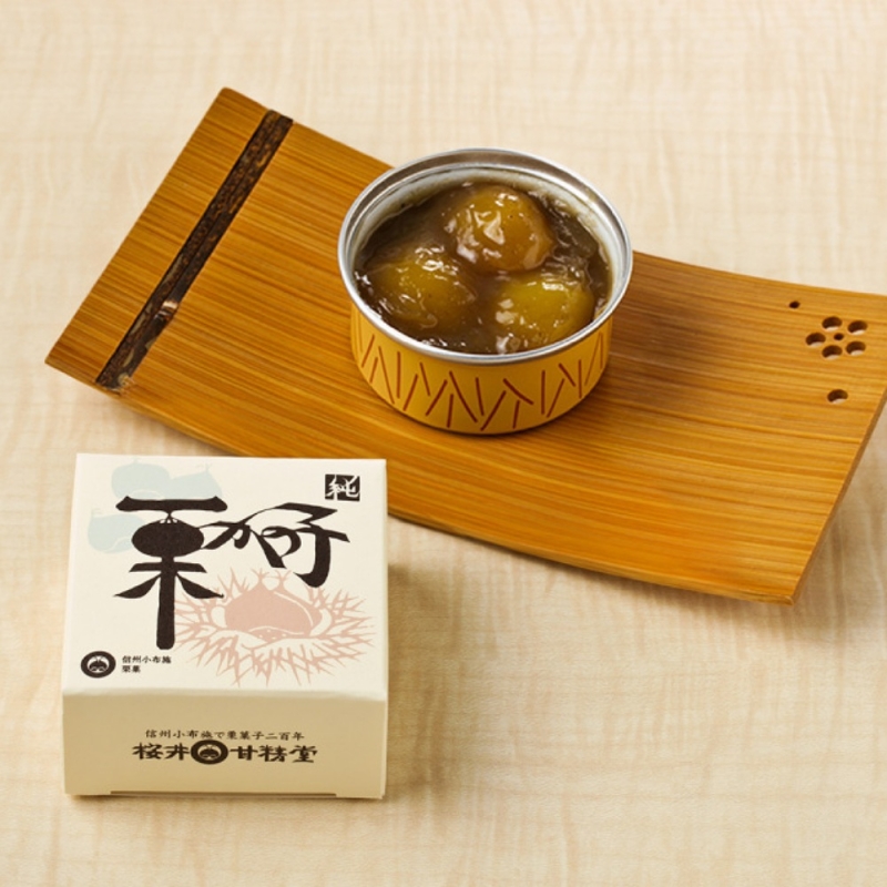 小布施をはじめ全国の名産地から厳選した上質な栗に砂糖を加えて練り上げた自家製の「栗あん」を、栗の甘露煮とからめ、手仕事でひとつひとつ丁寧に缶に詰めました。1缶に3つの栗粒が入った食べやすいサイズです。