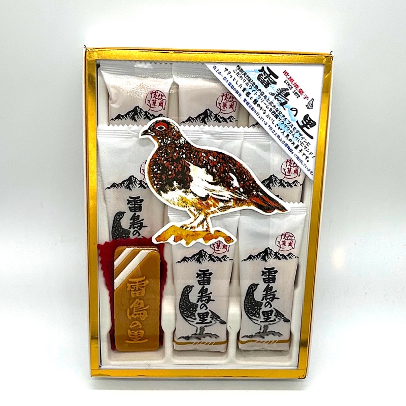 北アルプスの高山に生息する雷鳥をイメージして作られたお菓子です。さくっとした歯ざわりとまろやかな味が好評で、50年続いているロングセラー商品です。お茶菓子として、コーヒー、緑茶どちらにもぴったり。 会社などのお土産にも喜ばれます。