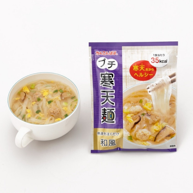寒天を使用した麺だから、とってもヘルシー。 マグカップサイズなのでランチや夜食にぴったりです。「和風」はだしのうま味が香るお吸い物風。 内容量 1食分12.2g