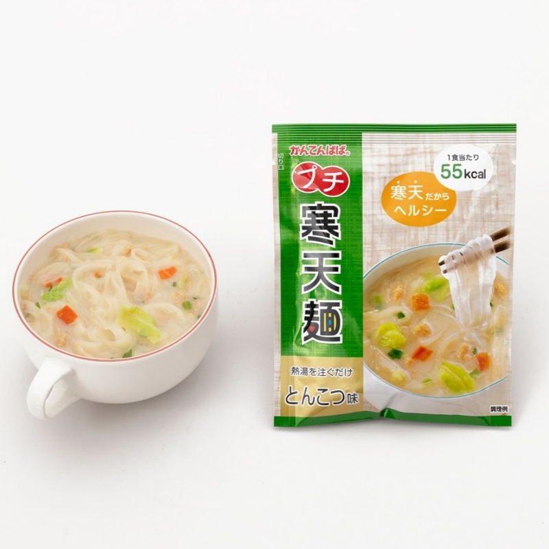 寒天を使用した麺だから、とってもヘルシー。 マグカップサイズなのでランチや夜食にぴったりです。「とんこつ味」は濃厚なとんこつのコクときゃべつの甘みがおいしい。 内容量 1食分16.4g