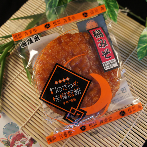 厳選された梅をじっくり漬け込み、味噌煎餅にたっぷりと使用しました。 原材料 米菓生地(うるち米(国産)、澱粉)、梅、梅エキス、植物油、ザラメ、醤油(小麦・大豆を含む)、砂糖、味噌、味醂、焼酎、蜂蜜、水飴、発酵調味料、液体調味料(アミノ酸液、水あめ、食塩、ぶどう糖)、ぶどう糖果糖液、かつお節エキス(さばを含む)、食塩、カツオ節エキスパウダー/調味料(アミノ酸等)