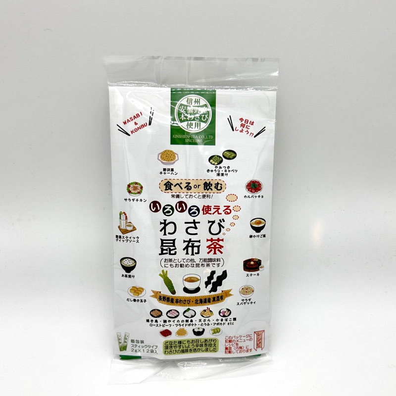 わさび入り昆布茶 原材料名 食塩(国内製造)、砂糖、粉未醤油(醤油、デキストリン)、昆布粉末、デキストリン、本わさび葉、かつおエキスパウダー、煮干エキスパウダー、かつお粉末 ・抹茶/調味料(アミノ酸等)、香料、香辛料抽出物、(一部に小麦・大豆を含む 内容量 24g(2g✕12袋)
