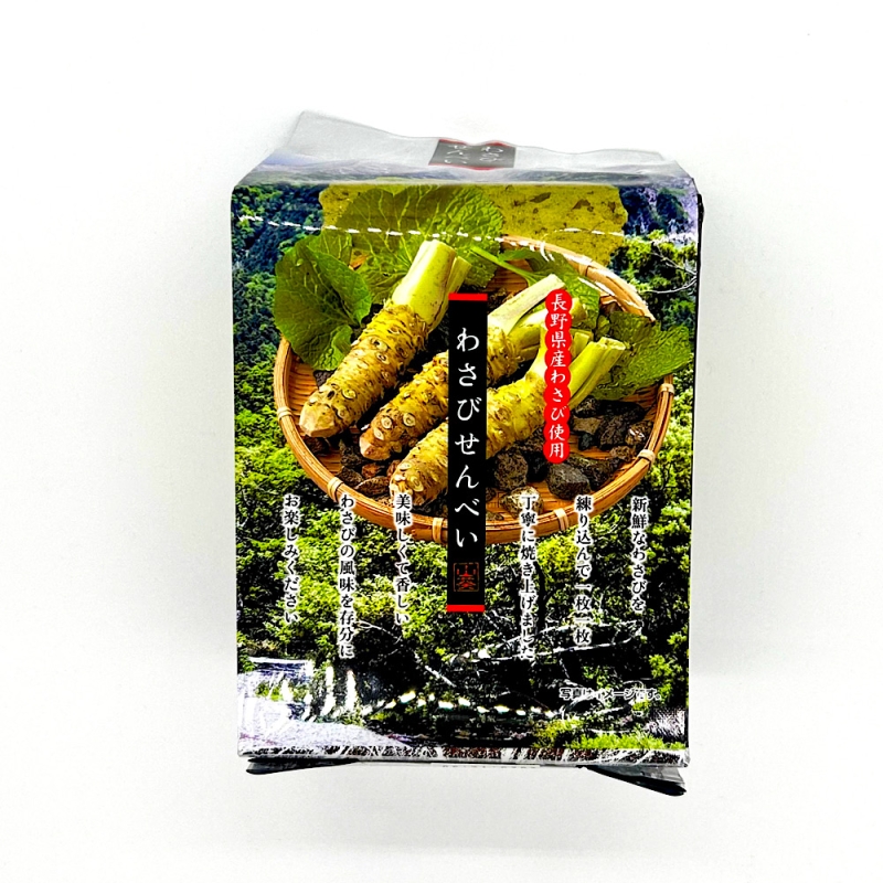 わさびせんべい 原材料名 澱粉(国内製造)、植物油脂、食塩、あおさ、えび、いか、わさびシーズニング(砂糖、カツオエキスパウダー、酵母エキスパウダー、食塩、原材料名乳糖)、わさび、唐辛子/加工デンプン、調味料(アミノ酸等)、着色料(クチナシ、カラメル)、香辛料抽出物、膨張剤、甘味料(ステビア)、(一部にえび・乳成分・いか・さば含む) 内容量 10枚(1枚✕10袋)