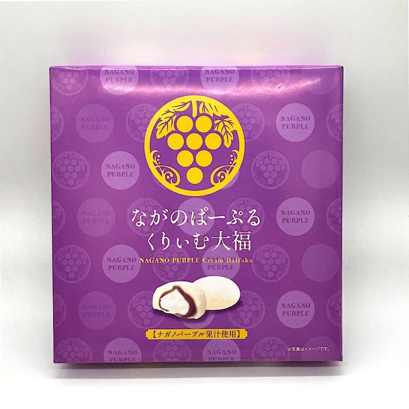 ぶどう餡(白生餡、グラニュー糖、水飴 還元水飴、ぶどう(ナガノパープル)果汁)(国内製造)、ホイップクリーム、(植物油脂、水飴、砂糖、卵白、澱粉、加糖練乳)水飴、砂糖、卵白、 澱粉、加糖練乳)餅粉、寒天/甘味料(トレハロース、ソルビトール)、グリシン、香料、乳化剤、着色料(二酸化チタン、青1、赤2)酸化防止剤(ビタミンE)、ph調整剤(一部に卵・乳成分・大豆を含む) 内容量 9個
